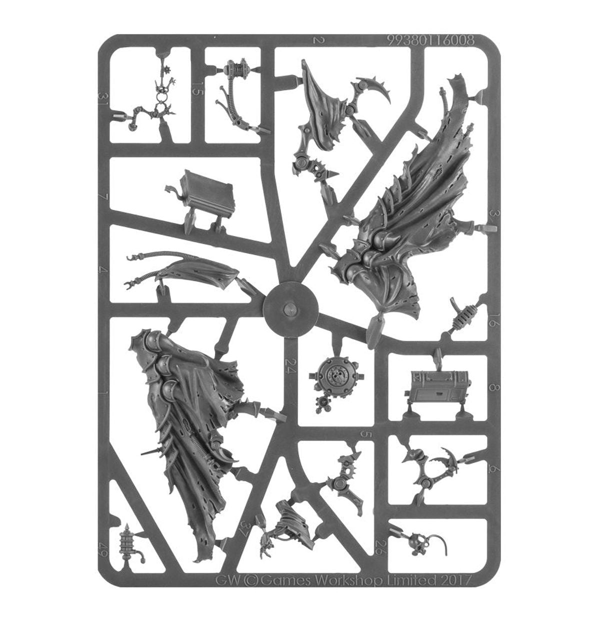 This multi-part plastic kit contains the components necessary to assemble Belisarius Cawl, Prime Conduit of the Omnissiah. Towering over his Adeptus Mechanicus brethren, he stands much taller than even other favoured Tech-Priests of the Omnissiah, with countless augmentations distorting his barely-human frame. He carries an Omnissian axe, which acts as a convenient mounting point for an array of sensors and his voice broadcasting unit, and an arc scourge – this arcane energy weapon is covered in cables, sensors and extra appendages. This theme of augmentation is continued throughout – Cawl’s robes are not-quite covering a massive amount of robotic extensions, with several extra legs, prehensile arms and cables dragging along behind him. A scryerskull hovers above, and there are several symbols of the Machine God dotted about the miniature.