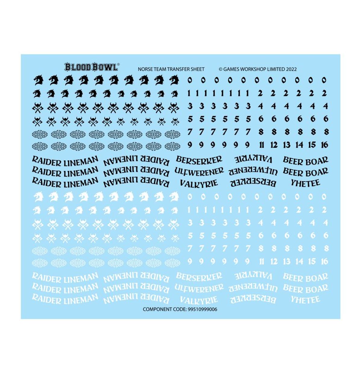 The multi-part kit is comprised of 120 plastic components with which you can assemble the Norsca Rampagers, a Norse team for use in games of Blood Bowl. The team is made up of 6 Norse Raider Linemen, 2 Beer Boar, 2 Norse Berserkers, 2 Ulfwereners and 2 Valkyries. In addition, there are 2 double-sided Blood Bowl coins, 2 turn and re-roll markers, 4 balls, and a transfer sheet with 292 decals.