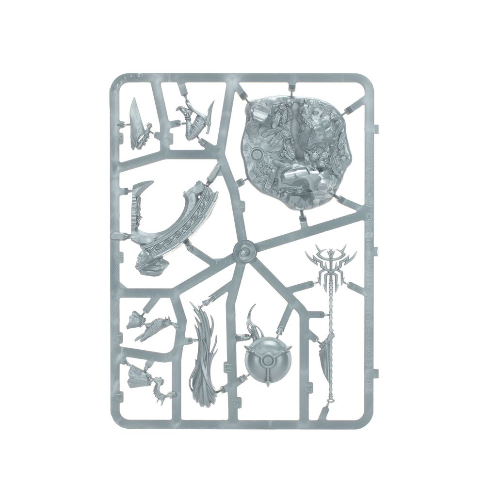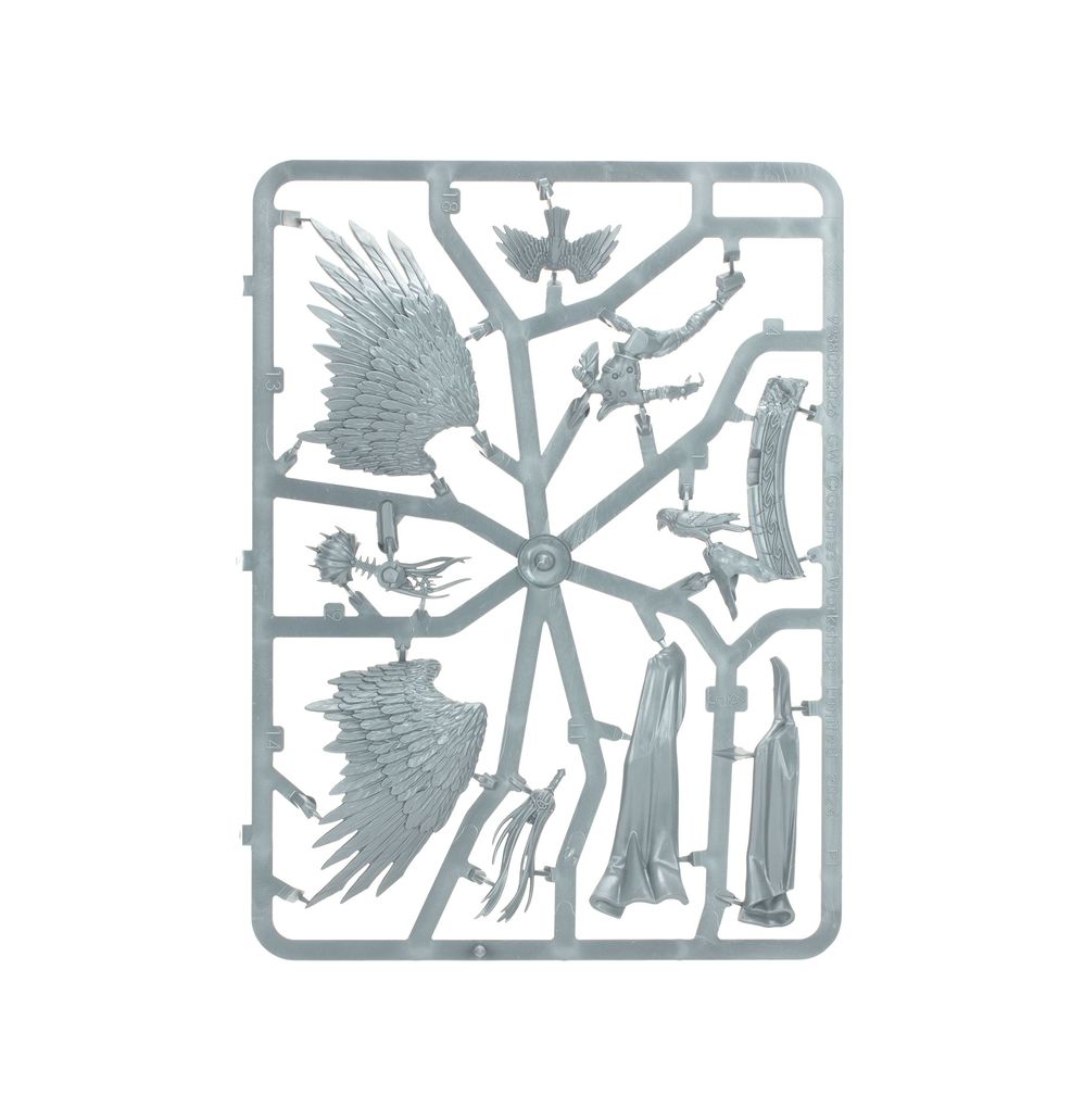 This multipart plastic kit builds Krethusa the Croneseer, an outcast prophet of the Daughters of Khaine. Krethusa carries the Staff of Morai-Heg, and wears the barbed circlet of her goddess over her sightless eyes. Shrouded by her divine wings, she perches over a sacrificial brazier, surrounded by crow familiars as she gazes into the future.