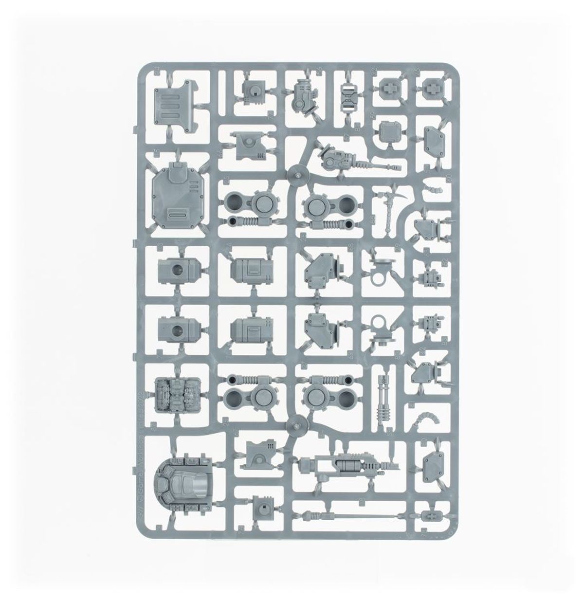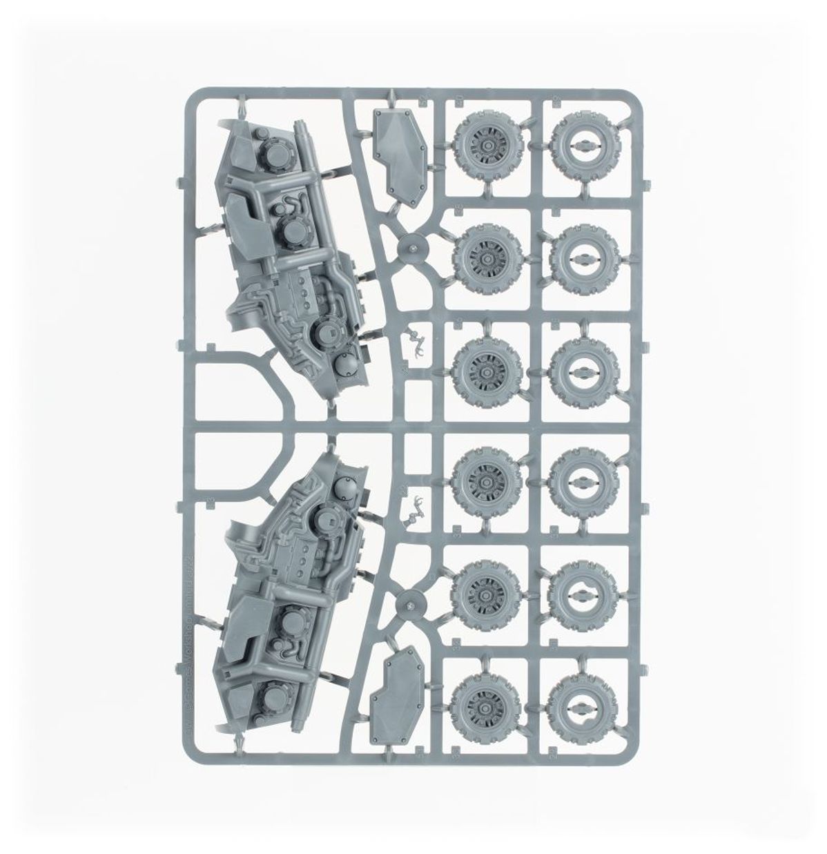 This box builds one Sagitaur, a fast-moving vehicle that combines firepower with the ability to carry a unit into battle. This sturdy six-wheeled vehicle boasts a hull-mounted twin bolt cannon, a rear transport hatch, and comes with a choice of four turret weapons operated by a robotic gunner – a HYLas beam cannon, L7 missile launcher, Sagitaur missile launcher, or MATR autocannon – providing the versatility to take on any threat. The Sagitaur's pilot is visible beneath a screen of clear plastic, with a choice of three different heads to customise your driver and keep each of your vehicles distinct.