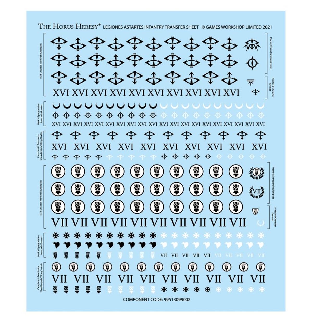 This multipart plastic kit builds 20 Space Marine Legionaries, which can be fielded in games of Warhammer: The Horus Heresy as a Legion Tactical Squad of 20 models, or two units of 10 models. Each of these Legionaries is armed with a Umbra-pattern bolter and bolt pistol, with a variety of additional components such as grenades and pouches, and can also be equipped with a bayonet or chain bayonet for melee fighting. You can also build up to two Legionaries with a Legion vexilla, two with a nuncio-vox, and two with an augury scanner. Accessories and alternate heads are included to build a Legion Tactical Sergeant for each of your squads – the kit offers a variety of extra weapon options for these unit leaders, including plasma pistols, power swords, power fists, and lightning claws. These models have no Legion markings, allowing Warhammer hobbyists to paint them in whichever colours they choose – however, the box includes a transfer sheet with 339 optional markings and iconography for the Sons of Horus and Imperial Fists Legions.