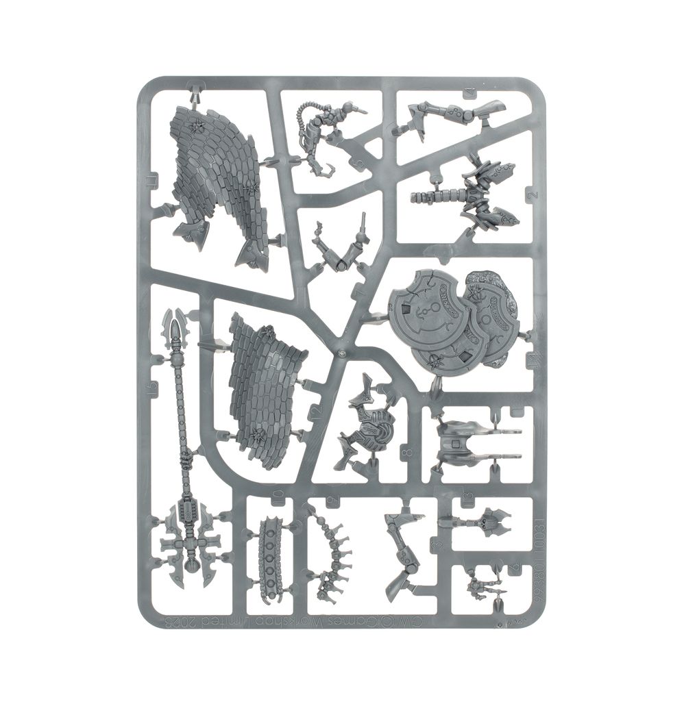 This multipart plastic kit builds Imotekh the Stormlord, the supreme leader of the Sautekh Dynasty. This imposing phaeron stands tall atop a dais of unearthed Necron architecture, his billowing cloak crawling with scarab-constructs. His left hand is encased in a Gauntlet of Fire, which generates waves of viridian flame, while his right grips the Staff of the Destroyer – his dynasty's deadly icon of office. Imotekh's armoured chestplate and metal brow sport lordly glyphs of Sautekh, while other Necrontyr sigils decorate his ornate mechanical body, proclaiming his rank as ruler of an unliving empire.