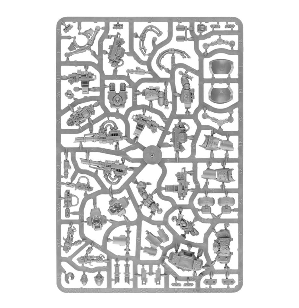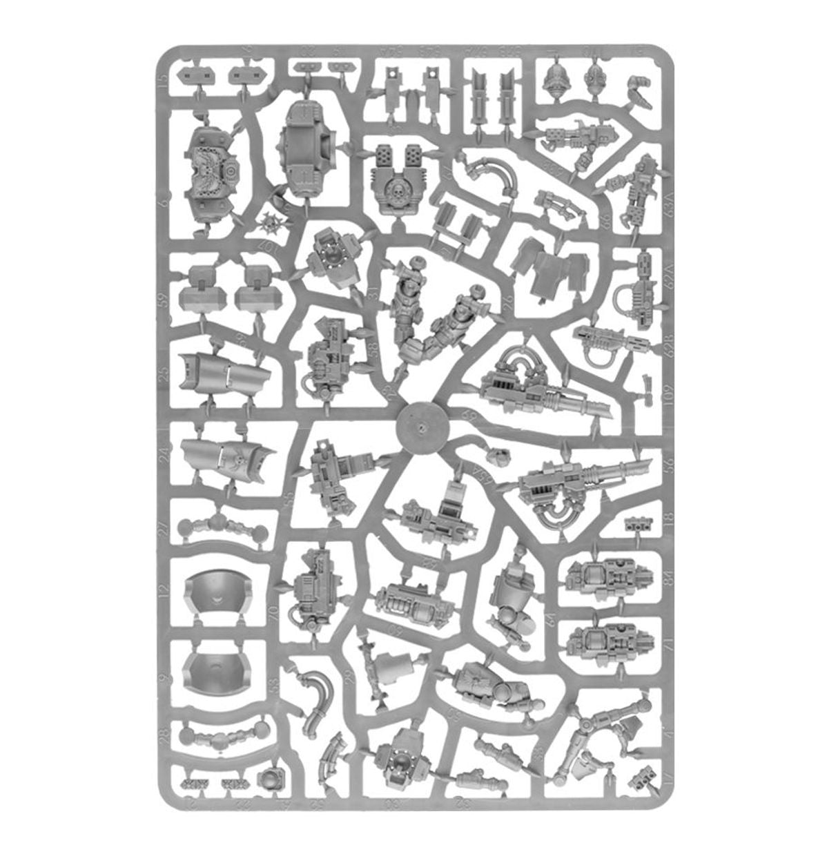 This 3 man kit makes the Centurion Assault Squad, providing every weapon and upgrade available to the unit. Before you add the specific weapon combinations you need to build the bodies. There are 3 distinct torsos; 3 individual sets of legs; 6 unique shoulder pad designs; and 7 heads (3 bare, and 4 helmeted) to choose from. The Centurion Assault Squad members are equipped with a siege drill on each arm, and have the choice of mounting either twin-linked flamers, or twin-linked meltaguns as well. The chest plates can be armed with either ironclad assault launchers or a hurricane bolter.