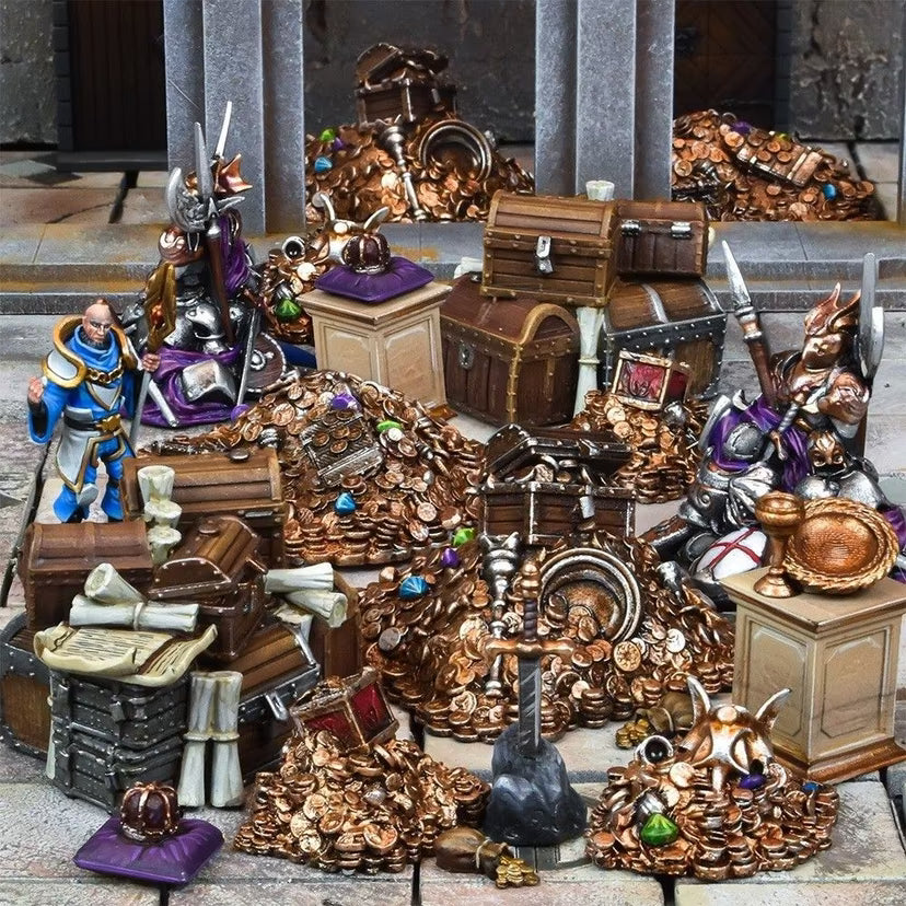 Perfect to represent the final area of a dungeon or the inner vaults of a dragon's hoard, this set includes material wealth of every kind! You'll find piles of gold coins, chests, crowns, armour and weapons, including the fabled sword in the stone... well, two actually!