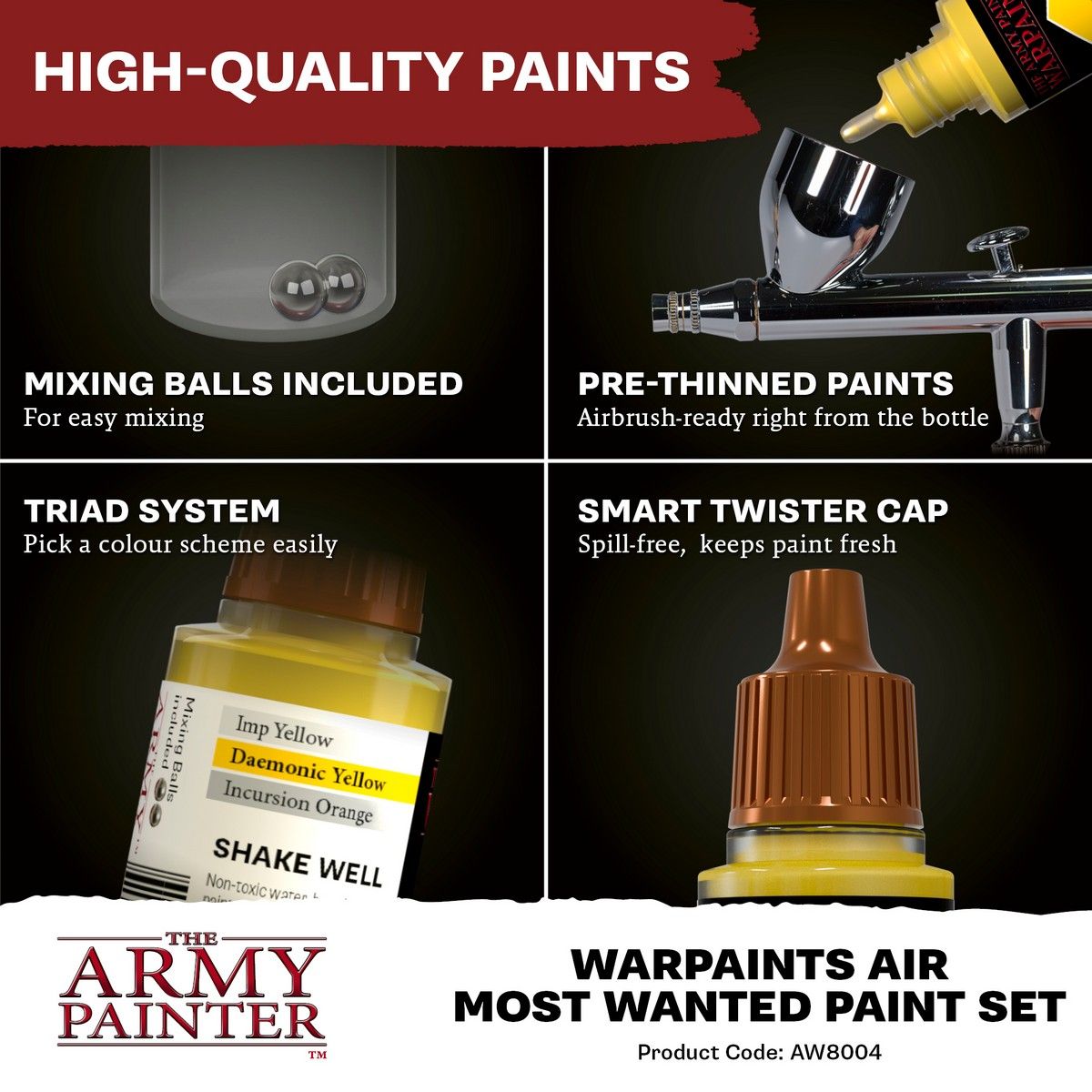 Upgrade your airbrush game with this set of 22 essential paints. Featuring 5 of our most-wanted Colour Triads for seamless shading and highlights, and 3 versatile Speedpaints for amazing filtering effects. Every paint comes pre-loaded with mixing-balls and is pre-thinned and ready to use straight from the bottle - No thinning required!