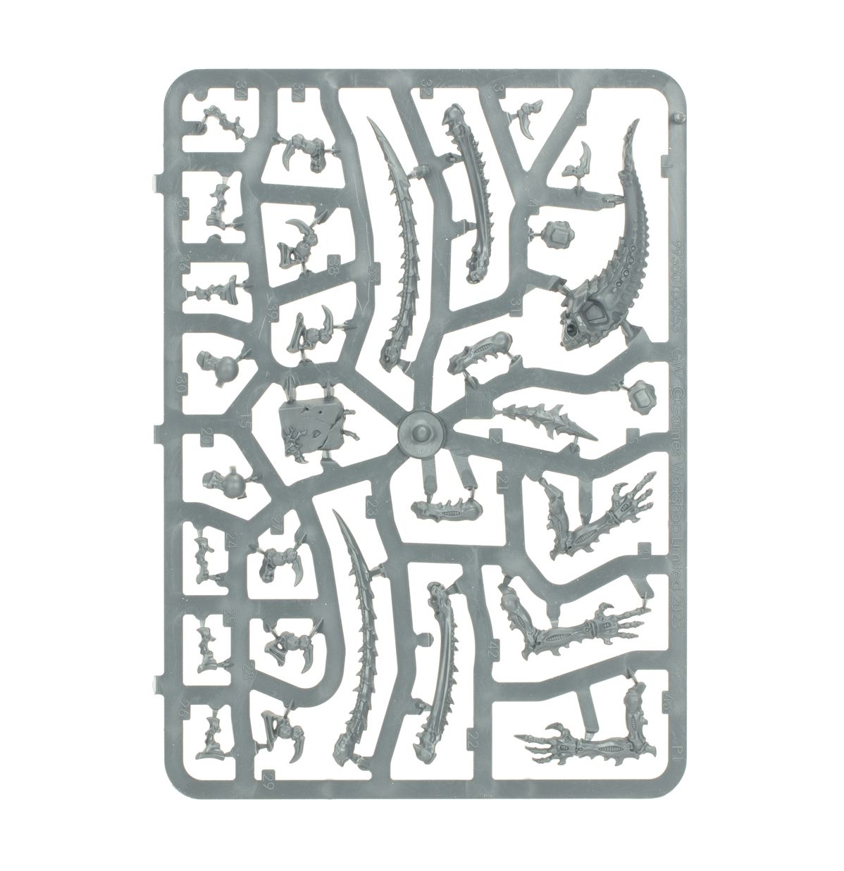 This multipart plastic kit builds a Lictor, a fearsome Tyranid ambush predator. This cunning creature lunges from shadows and darts up sheer vertical surfaces to tear foes apart, striking with its distinctive mantis-like talons. The Lictor's feeder tendrils allow it to even digest a victim's memories, and the kit includes two different heads – one with trailing feeder tendrils, the other with its tendril membrane aggressively flared.